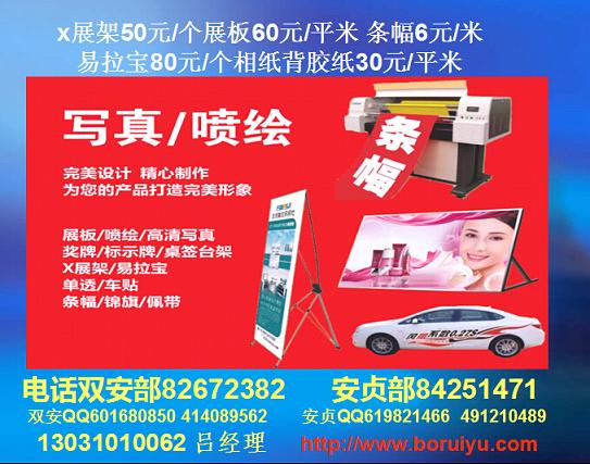 我公司制作易拉寶、X展架、拉網(wǎng)、燈片、燈箱布、網(wǎng)格布、單透、高光相紙、掛軸、車帖等寫真噴繪產(chǎn)品,進口機器制作,質(zhì)優(yōu)價廉,歡迎惠顧!寫真輸出(燈片 全透片 海報背膠 相紙),噴繪輸出(網(wǎng)格布 燈布 車身貼),制作 易拉寶 X架 拉網(wǎng)展架 電腦刻字,KT板,大型活動,及各類展版噴繪,寫真,展板,展架,易拉寶,X展架,,廣告條幅。